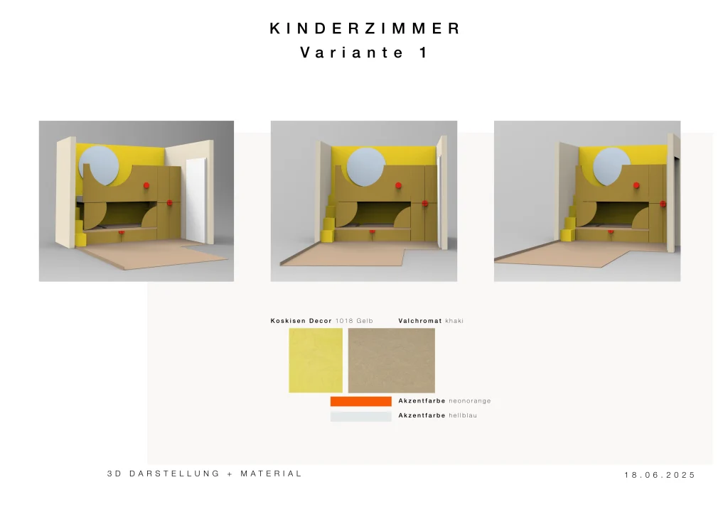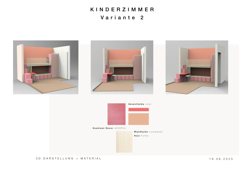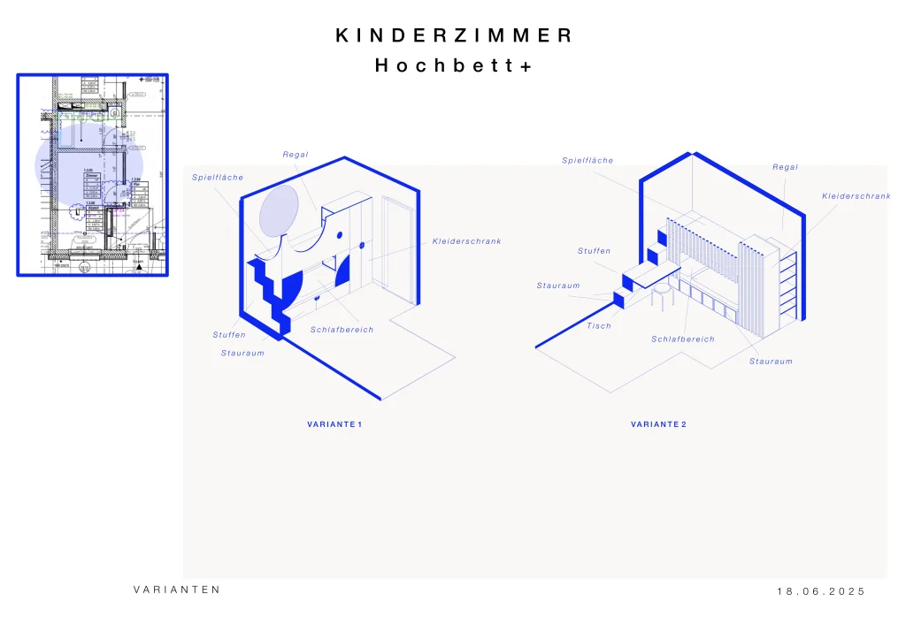 Der Entwurf des Hochbettes setzt auf Raumoptimierung und klare Linien. Die erhöhte Schlafebene schafft zusätzlichen Nutzraum darunter, der flexibel als Arbeits- oder Rückzugsbereich genutzt werden kann. Durch die reduzierte Formensprache und hochwertige Materialien entsteht ein Möbelstück, das sowohl funktional als auch wohnlich wirkt.