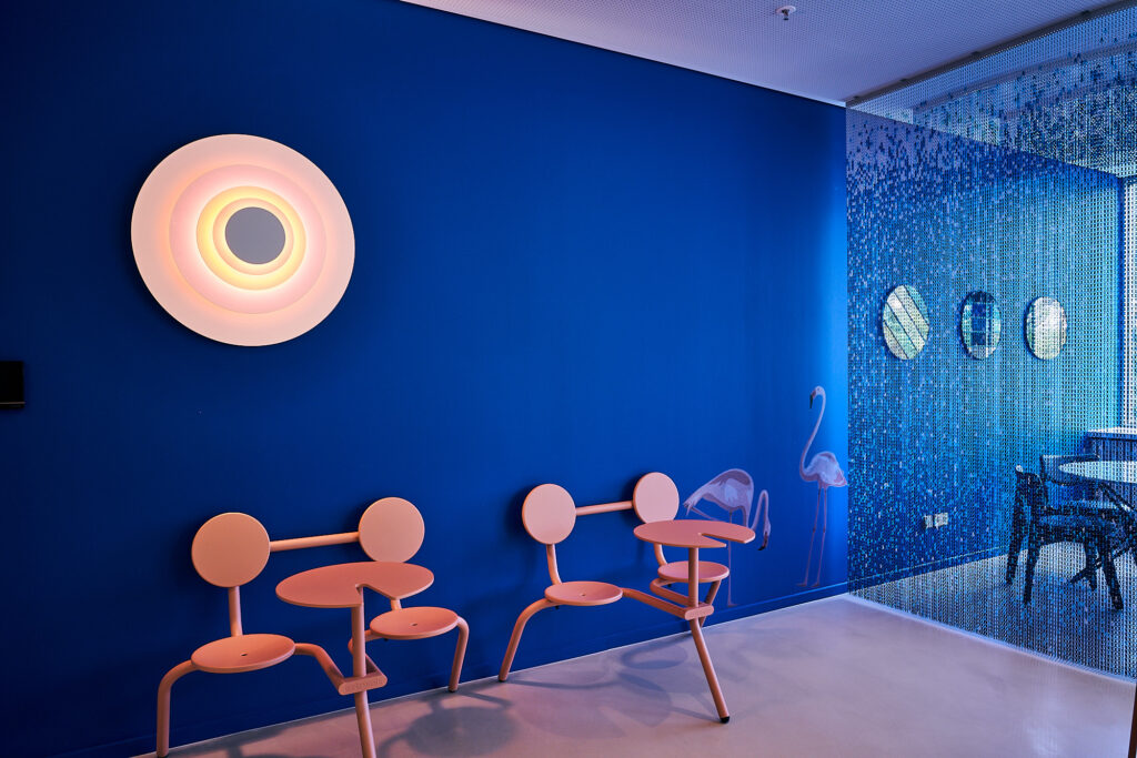 So entsteht ein Social Space, der Bewegung, Begegnung und kurze Auszeiten im Arbeitsalltag unterstützt und das Motiv Strand nicht dekorativ, sondern räumlich interpretiert.